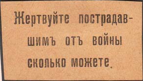 1915 1915(?) г. Разм. 55 х 28 мм. Одноцветная печать на желтой бумаге. В центре текст в три строки: «Жертвуйте пострадавшим от войны сколько можете».