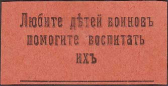 1915 1915(?) г. Разм. 55 х 28 мм. Одноцветная печать на бумаге различных цветов. В центре текст в три строки: «Любите детей воинов помогите воспитать их».