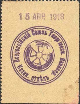 1918 1918 г. 15.04.1918 г. Разм. ≈ 45 х 59 мм. Зубц. 10. Одноцветная печать на бумаге различных цветов. В центре круглая фиолетовая печать Казанского отдела Всероссийского Союза Георгиевских Кавалеров. В двойной круглой рамке диаметром 34 мм в центре в круге Георгиевский крест в венке. По окружности текст: «Казан[ский]. отдел. Всероссийский Союз Георгиевск[их]. Кавалер[ов].». Сверху ручным каучуковым штампом дата: «15 апр[еля]. 1918».