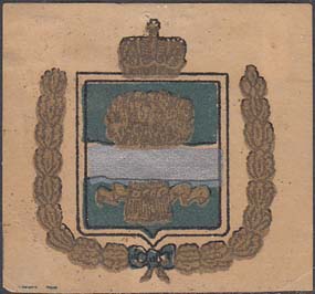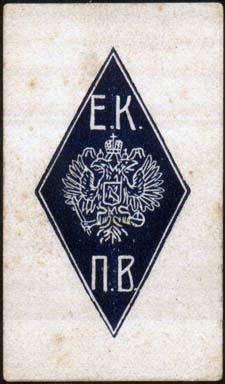 1915 1915(?) г. Разм. 37 х 63 мм. Одноцветная печать на толстой белой бумаге. В центре ромб разм. 26 х 49 мм. В ромбе на сплошном фоне герб России и буквы аббревиатуры «Е.К.П.В.».