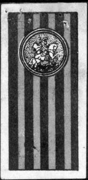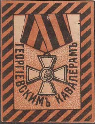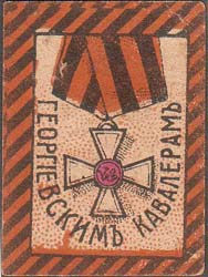 1914 1914 г. Разм. 31 х 41 мм. Двухцветная печать на толстой желтоватой бумаге. В рамке из наклонных полосок цветов георгиевской ленты в центре Георгиевский крест. Внизу текст полукругом: «Георгиевским кавалерам».