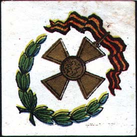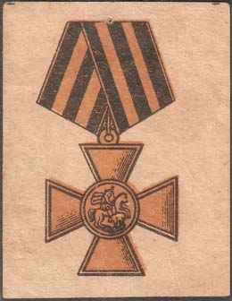 1915 1915(?) г. Разм. 43 х 56 мм. Двухцветная печать на желтоватой бумаге. В центре Георгиевский крест.