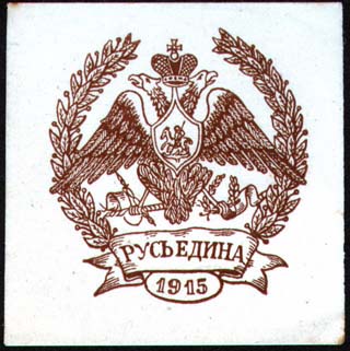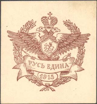 1915 1915 г. Разм. 54 х 54 мм. Одноцветная печать на тол-стой белой бумаге. В центре в обрамлении венка двуглавый орел с царской короной и гербом Москвы на груди. Внизу на ленте текст: «Русь едина 1915».