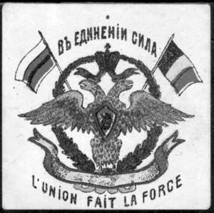 1915 1915 г. Разм. 45 х 44 мм. Многоцветная печать на белой бумаге. В центре двуглавый орел на фоне венка и флагов России и Бельгии. Сверху полукругом текст на русском языке: «В единении сила». Внизу полукругом тот же текст на французском языке.