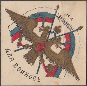 1915 1915 г. Ромб разм. ≈ 65 х 65 мм. Многоцветная печать на белой бумаге. Двуглавый орел на фоне двух скрещенных российских флагов. Сверху текст в две строки: «На здравницы». Внизу продолжение текста: «Для воинов».