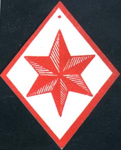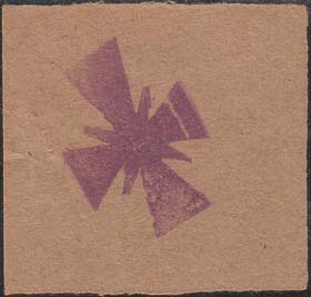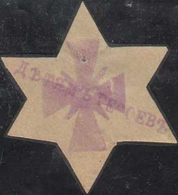 1915 1915(?) г. Ромб разм. 41 х 51 мм. Одноцветная печать на толстой белой бумаге. В рамке в форме ромба в центре шестиконечная звезда. Сверху точка, обозначающее место для прокола булавкой.