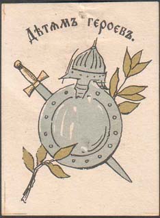 1916 1916 г. 05.10.1916 г. Разм. 40 х 54 мм. Трехцветная печать на белой бумаге. В центре доспехи и лавровая ветвь. Сверху полукругом текст: «Детям героев».