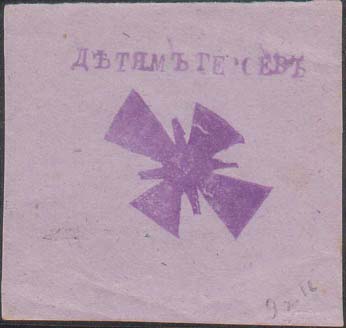1916 1916 г. 09.10.1916 г. Разм. 58 х 54 мм. Одноцветная печать на серо-синей бумаге. В центре фиолетовый оттиск ручного штампа в виде стилизованного георгиевского креста. Сверху оттиск ручного штампа с текстом: «Детям героев».