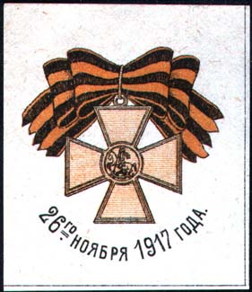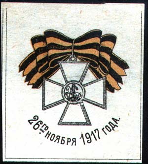 1917 1917 г. 26.11.1917 г. Разм. 46 х 54 мм. Двухцветная печать на желтоватой бумаге. В центре Георгиевский крест на ленте. Внизу полукругом текст: «26-го ноября 1917 года».