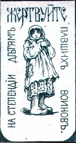 1916 1916 г. 25.09.1916 г. Разм. 43 х 80 мм. Одноцветная печать на бумаге различных цветов. В центре девочка в зимней одежде. По периметру текст: «Жертвуйте на стипендии детям павших воинов».
