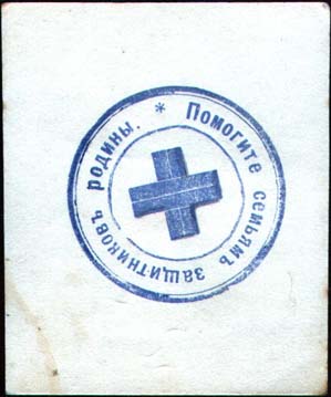 1915 1915(?) г. Разм. 49 х 59 мм. Одноцветная печать на белой бумаге. В центре круглая печать диаметром 32 мм. В центре печати в двойной круглой рамке знак Красного Креста. По окружности между рамками текст: «Помогите семьям защитников Родины».