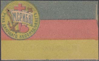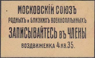 1917 1917 г. 10.-12.09.1917 г. Разм. 53 х 34 мм. Многоцветная двухсторонняя печать на сероватой бумаге. На лицевой стороне на фоне трехцветного флага (голубой, розовый, желтый (?)) слева сверху эмблема Московского Союза родных и близких военнопленных. На оборотной стороне текст в четыре строки черным шрифтом: «Московский союз родных и близких военнопленных Записывайтесь в члены. Воздвиженка 4. Кв.35.».