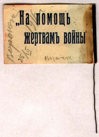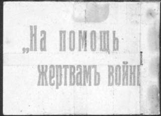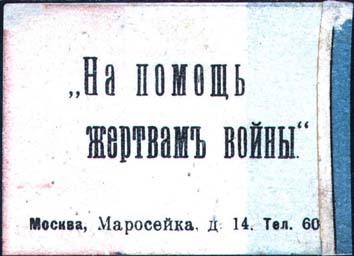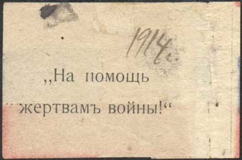 1914 1914 г. 1914 г. Разм. 50 х 34 мм. Одноцветная, двухцветная и трехцветная двухсторонняя печать на белой бумаге. Виньетки в виде флагов стран-союзниц России в Первой мировой войне. На оборотной стороне текст в две строки: «На помощь жертвам войны».