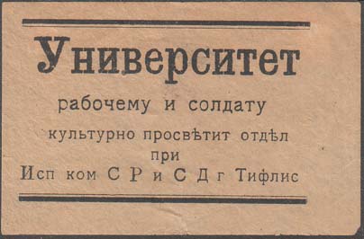 1917 1917 г. Разм. 67 х 43 мм. Одноцветная печать на тонкой желтоватой бумаге. В центре между двумя горизонтальными полосами текст в пять строк: «Университет рабочему и солдату. Культурно просветит[ельный]. Отдел при Исп[олнительном]. Ком[итете]. СР и СД г. Тифлис».