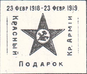1919 1919 г. 23.02.1919 г. Разм. 59 х 49 мм. Одноцветная печать на желтоватой бумаге. В центре пятиконечная звезда с плугом и молотом в центре. По пери-метру текст: «23. февр[аля]. 1918 – 23 февр[аля]. 1919. Красный подарок Кр[асной]. Армии».