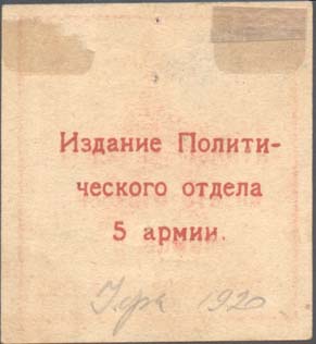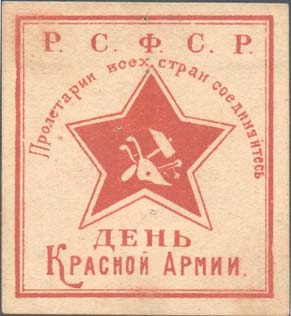 1920 1920 г. Разм. 48 х 53 мм. Одноцветная двухсторонняя печать на желтоватой бумаге. На лицевой сто-роне в двойной прямоугольной рамке разм. 43 х 48 мм в центре пятиконечная звезда с плугом и молотом в центре. Сверху текст в две строки: «Р.С.Ф.С.Р. Пролетарии всех стран соединяйтесь!». Внизу текст в две строки: «День Красной Армии». На оборотной стороне текст в три строки: «Издание Политического отдела 5 армии».
