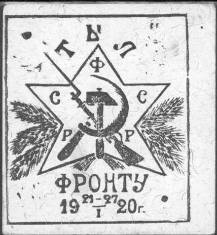 1920 0 г. 1920 Разм. 71 х 72 мм. Одноцветная печать на толстой бумаге различных цветов и качества. В центре на фоне венка из еловых веток пятиконечная звезда с буквами «РСФСР» в лучах. В центре звезды скрещенные серп и молот и винтовка со штыком. Текст в три строки: «Тыл фронту 19 21-27/I 20 г.».