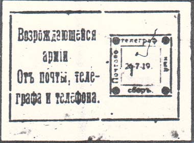 1919 1919 г. 26.07.1919 Одноцветная двухсторонняя печать на желтоватой бумаге. На лицевой стороне в прямоугольной рамке разм. 49 х 32 мм слева текст в четыре строки: «Возрождающейся армии от почты, телеграфа и телефона». Справа в двойной прямоугольно рамке дата: «26.7.19». По периметру между рамками текст, разделенный декоративными элементами: «Почтово-телеграфный сбор». На оборотой стороне стилизованное изображение конверта.