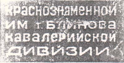 1920 1920(?) г. Разм. 64 х 32 мм. Двухцветная печать на белой бумаге. На сплошном черном фоне текст в четыре строки: «Краснознаменной им. т. Блинова кавалерийской дивизии».