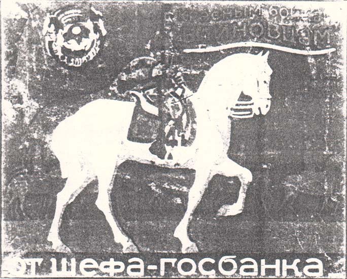 1920 1920(?) г. Листок разм. 116 х 92 мм. Многоцветная печать на белой бумаге. В центре всадник на лошади со знаменем. На полотнище знамени орден Красного Знамени. На заднем плане всадники на лошадях. В правом верхнем углу текст в две строки: «Красным бойцам Блиновцам». Внизу продолжение текста: «От шефа - Госбанка».