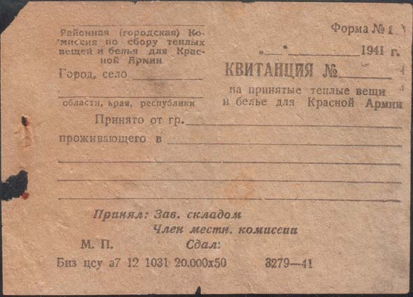1941 1941 г. Листок из квитанционной книжки разм. 99 х 70 мм. Лдноцве ная печать на желтоватой бумаге низкого качества. В цен ре текст в восемь строк: «Принято от гр[ажданина]. ... проживающего в ... Принял: Зав[едующий]. складом ... Член местн[ой]. комиссии ... М[есто].П[ечати]. Сдал: ...». В левом верхнем углу текст в семь строк: «... Районная (городская) Комиссия по сборц теплых вещей и белья для Красной Армии. Город, село ... области, края, республики». В правом верхнем углу текст в пять строк: «Форма №1 «...» ... 1941 г. Квитанция № ... на принятые теплые вещи и белье для Красной Армии». Внизу мелким шрифтом выходные данные: «Биз ЦСУ а7 1031 20.000 х 50 3279-41».