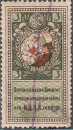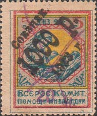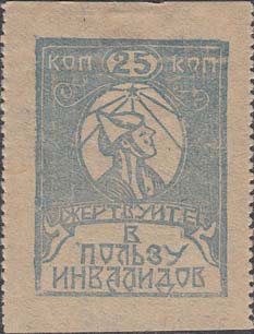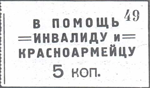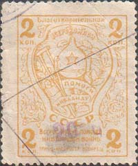 1922 1922 г. 1922 г. (Октябрь). Первый всероссийский выпуск. Круг с волнистыми краями, напоминающий сургучную печать. Двухцветная печать на толстой сероватой бумаге с тиснением. В центре красноармейский шлем, под ним костыль с дубовая ветвь. Внизу номинал. Сверху по внутреннему периметру рамки текст: «Всеросс[ийский]. ком[итет]. пом[ощи]. инвалидам».