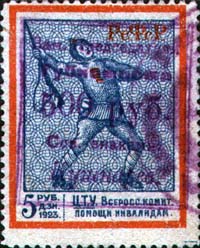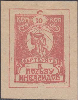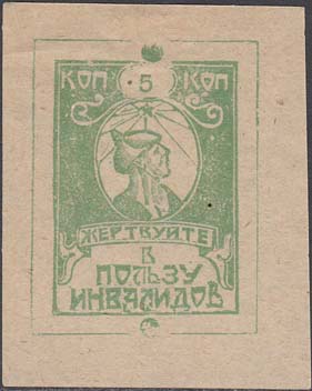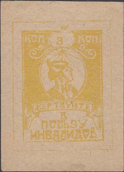 1924 1924 г. Разм. 45 х 58 мм. Одноцветная печать на желтовато-серой бумаге. Б.З и вертикальная зубц. 11 1/2. В двойной прямоугольной рамке разм. 35 х 45 мм в центре в овале изображение красноармейца в профиль. Сверху номинал. Внизу текст в четыре строки: «Жертвуйте в пользу инвалидов».