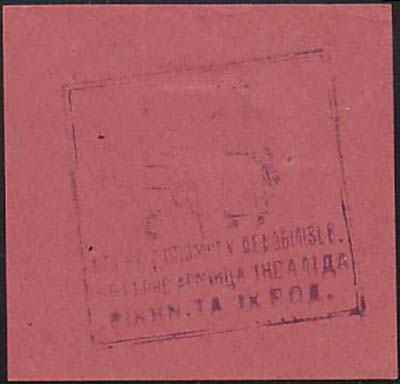 1925 1925(?) г. Разм. 72 х 69 мм. Одноцветная печать низкого качества ручным каучуковым штампом на розовой бумаге. В двойной прямоугольной рамке разм. 50 х 48 мм крестьянин и красноармеец пожимают друг другу руки. Внизу текст в три строки на украинском языке: «Окажи помощь демобилизов[анному]. красноармейцу, инвалиду войны и их семьям».