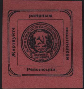 1919 1919 г. 12.10.1919 г. Разм. рамки 46 х 47 мм. Одноцветная печать на светло-малиновой бумаге. В двойной линейной рамке с закругленными углами в центре в дополнительной прямоугольной рамке герб Р.С.Ф.С.Р. По периметру между рамками текст: «Жертвуйте раненым защитникам революции».