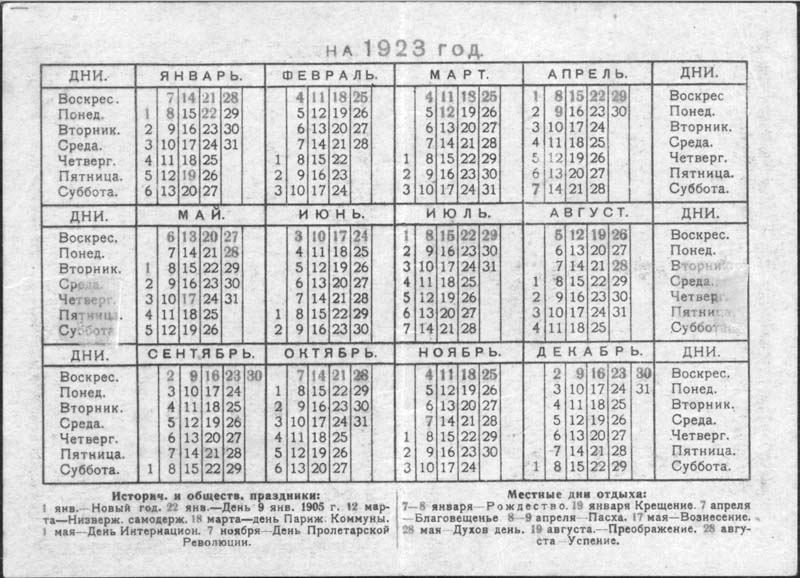 1922 1922 г. 1922 г. Специальный выпуск. Разм. » 156 х 112 мм. Двухцветная двухсторонняя печать на толстой светло-серой бумаге. На лицевой стороне слева в прямоугольной декоративной рамке разм. 68 х 69 мм в центре текст в девять строк: «Всероссийский комитет помощи больным и раненым красноармейцам и инвалидам войны». Сверху серп и молот. Внизу под рамкой мелким шрифтом выходные данные: «Типо-Лит. К.В.Т. им. т. Дунаева б. Бр. Менерт, Москва. Главлит №5664». Справа в прямоугольной декоративной рамке разм. 67 х 100 мм. текст в семь строк: «Табель-Календарь на 1923 год. Цена 100 руб. дензн. 1922 г. Цена никем не может быть повышена». Справа внизу под рамкой текст: «№6». На оборотной стороне календарь на 1923 год. Слева внизу перечисление исторических и общественных праздников, справа внизу перечисление местных дней отдыха.