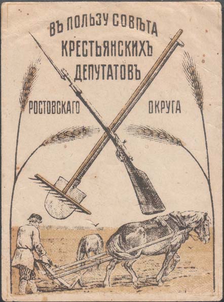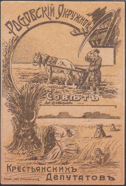 1919 1919(?) г. Разм. 73 х 101 мм. Двухцветная печать на кремовой бумаге. В центре скрещенные лопата, грабли и винтовка в обрамлении колосьев. Сверху текст в четыре строки: «В пользу Совета Крестьянских депутатов Ростовского округа». Внизу пахарь в поле.