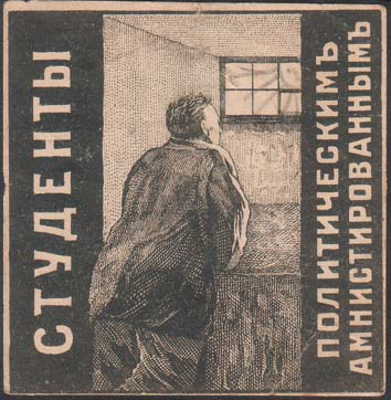 1917 1917(?) г. Разм рамки 57 х 59 мм. Одноцветная печать на белой бумаге. В центре заключенный в камере стоит у окна. Слева вертикально текст: «Студенты». Справа вертикально продолжение текста в две строки: «Политическим амнистированным».