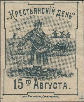 1917 1917 г. 15.08.1917 г. Разм. 48 х 59 мм. Одноцветная печать на бумаге различных цветов. В центре в прямоугольной рамке разм. 42,5 х 53,5 мм с декоративными уступами крестьянин с лукошком, сеющий зерно. На заднем фоне ветряные мельницы. Сверху полукругом текст: ««Крестьянский день»». Внизу дата: «15-го Августа». Внизу под рамкой выходные данные мелким шрифтом: «Лит. Якубовича, Симферополь».