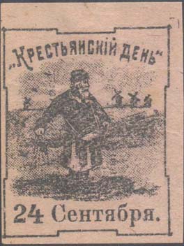 1918 1918(?) г. 24 сентября Разм. 44 х 58 мм. Одноцветная печать на розово-серой бумаге. В центре в прямоугольной рамке разм. 40 х 50 мм с декоративными уступами крестьянин с лукошком, сеющий зерно. На заднем фоне ветряные мельницы. Сверху полукругом текст: ««Крестьянский день»». Внизу дата «24 сентября».