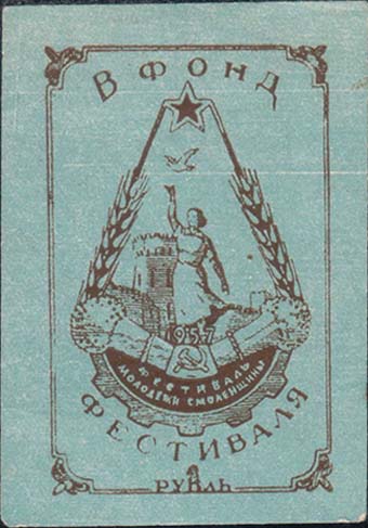 1957 1957 г. Разм. 52 x 73 мм. Двухцветная печать на белой бумаге. В прямоугольной декоративной рамке разм. 40 х 63 мм в центре значок фестиваля молодежи Смоленщины. Сверху полукругом текст: «В фонд». Внизу продолжение текста полукругом: «Фестиваля» и номинал.