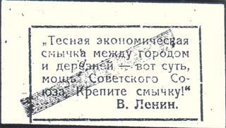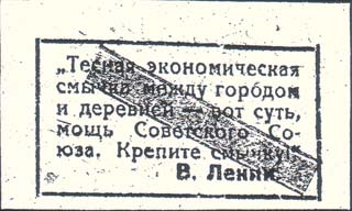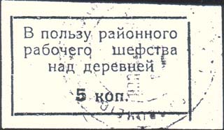 1932 1932 г. Разм. 53 x 30 мм. Двухцветная двухсторонняя печать на толстой желтоватой бумаге. На лице-вой стороне в прямоугольной рамке разм. 41,5 х 22 мм сверху текст в три строки: «В пользу районного рабочего шефства над деревней». Внизу номинал. На оборотной стороне в прямоугольной рамке разм. 41,5 х 22 мм текст в шесть строк: ««Тесная экономическая смычка между городом и деревней - вот суть, мощь Советского Союза. Крепите смычку!». В.Ленин». На оборотной стороне широкая красная полоса. На лицевой стороне фиолетовый оттиск круглой контрольной печати.