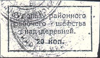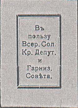 1919 1919(?) г. Разм. 37 х 51 мм. Одноцветная печать на толстой бумаге различных цветов. В двойной рамке разм. 21 х 35 мм текст в семь строк: «В пользу Всер[оссийского]. Сол[датских]. Кр[естьянских]. Депут[атов]. и Гарниз[нного]. Совета».