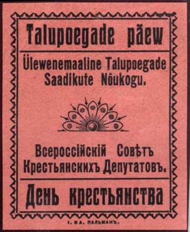 1917 1917 г. Разм. 46 х 56 мм. Одноцветная печать на лило-во-розовой бумаге. В двойной прямоугольной декоративной рамке разм. 40 х 50 мм в центре декоративный элемент. Сверху текст в три строки на эстонском языке. Внизу текст в три строки: «Всероссийский Совет Крестьянских Депутатов. День Крестьянства». Под рамкой петит: «I. И А. Пальман».