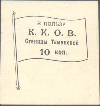 1924 1924 г. Разм. 56 х 60 мм. Одноцветная печать на белой бумаге. В центре флаг с древком. На полотнище флага текст в три строки: «В пользу К.К.О.В. Станицы Таманской». Ниже номинал.