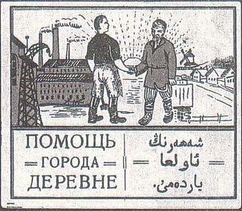 1926 1926(?) г. Разм. 58 х 50 мм. Двухцветная печать на белой бумаге. В прямоугольной рамке разм. 54,5 х 46 мм сверху рабочий и крестьянин пожимают друг другу руки на фоне аграрно-индустриального пейзажа. Внизу слева тест в три строки: «Помощь города деревне». Справа внизу текст в три строки на узбекском языке арабским шрифтом.