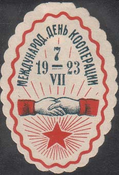 1923 1923 г. 07.07.1923 г. Овал с фигурными краями разм. 39 х 57 мм. Двухцветная печать на белой бумаге. В овальной волнистой рамке разм. 34 х 51 мм в центре две руки в рукопожатии. Сверху текст в две строки: «Международ[ный]. день кооперации 19 7/VII 23». Внизу пятиконечная звезда с лучами.
