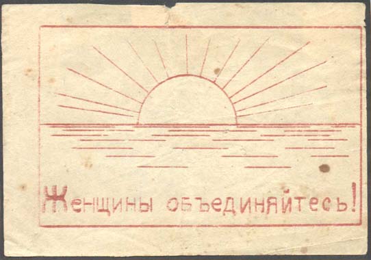 1917 1917(?) г. Разм. 90 х 63 мм. Одноцветная печать на бледно-желтой бумаге. В прямоугольной рамке разм. 80 х 49 мм солнце с лучами, встающее над морем. Внизу текст: «Женщины объединяйтесь!».