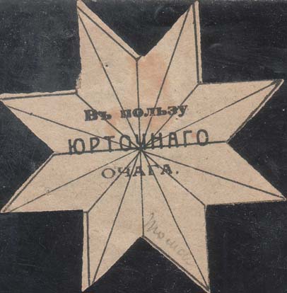 1918 1918(?) г. Виньетка в форме восьмилучевой звезды разм. 70 х 70 мм. Одноцветная печать на бледно-серой (оттенки) бумаге. В центре текст в три строки: «В пользу Юрточного очага».