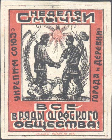1926 1926(?) г. Разм. 62 х 77 мм. Двухцветная печать на белой бумаге. В тройной прямоугольной рамке разм. 52 х 68 мм в центре крестьянин с косой и рабочий с молотом пожимают друг другу руки. Сверху солнце с лучами. По периметру между рамками на сплошном фоне текст: «Неделя смычки. Все в ряды шефского общества. Укрепим союз города и деревни». Внизу между рамками выходные данные мелким шрифтом: «Ульяновск. Гублит № 123».