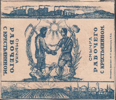 1927 1927(?) г. 1927(?) г. Разм. 77 х 67 мм. Одноцветная печать на кремовой бумаге. В прямоугольной рамке разм. 76 х 65 мм в центре крестьянин с косой и рабочий с молотом пожимают друг другу руки. Сверху солнце с лучами. Слева и справа вертикально текст в три строки: «Смычка рабочего с крестьянином». Сверху городской пейзаж. Снизу сельский пейзаж. Справа вертикальном выходные данные мелким шрифтом: «Ульяновск типо-лит №19 комбината П.П.П.».
