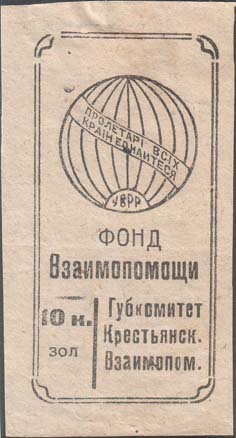 1924 1924 г. Разм. 39 х 73 мм. Одноцветная печать на бумаге различных цветов. В двойной прямоугольной рамке разм. 31 х 62 мм с закругленными углами в центре текст в две строки: «Фонд Взаимопомощи». Сверху стилизованное изображение земного шара. На земном шаре по диагонали на ленте текст на украинском языке: «Пролетарии всех стран соединяйтесь» и аббревиатура на украинском языке: «УССР». Внизу слева номинал, справа текст в три строки: «Губкомитет Крестьянск[ой]. Взаимопом[ощи].».