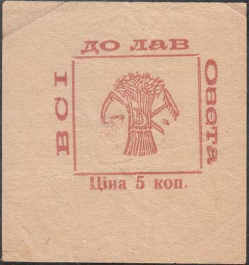 1931 1931 г. Разм. 60 х 63 мм. Одноцветная печать на желтоватой бумаге. В центре в прямоугольной рамке разм. 31,5 х 29 мм эмблема ОЗЕТа: сноп, серп и скрещенные коса и грабли. По наружному периметру рамки текст на украинском языке: «Все в ряды Озета. Цена 5 коп».