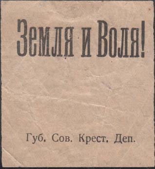 1917 1917 г. Разм. 53 х 57 мм. Одноцветная печать на тонкой светло-серой бумаге. Сверху текст: «Земля и Воля!». Внизу текст: «Губ[ернский]. Сов[ет]. Крест[ьянских]. Деп[утатов].».