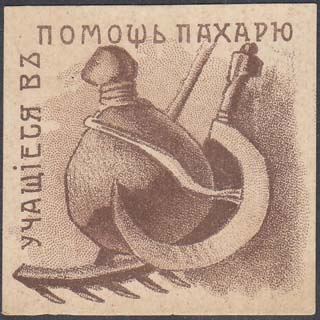 1917 1917 г. Май. Разм. 53 х 53 мм. Одноцветная печать на плотной белой бумаге. В центре грабли, серп и фляга с водой. Слева и сверху текст: «Учащийся в помощь пахарю».