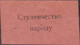 1917 1917(?) г. Разм. 46 х 26 мм. Одноцветная печать на розово-серой бумаге. В центре текст в две строки: «Студенчество народу».
